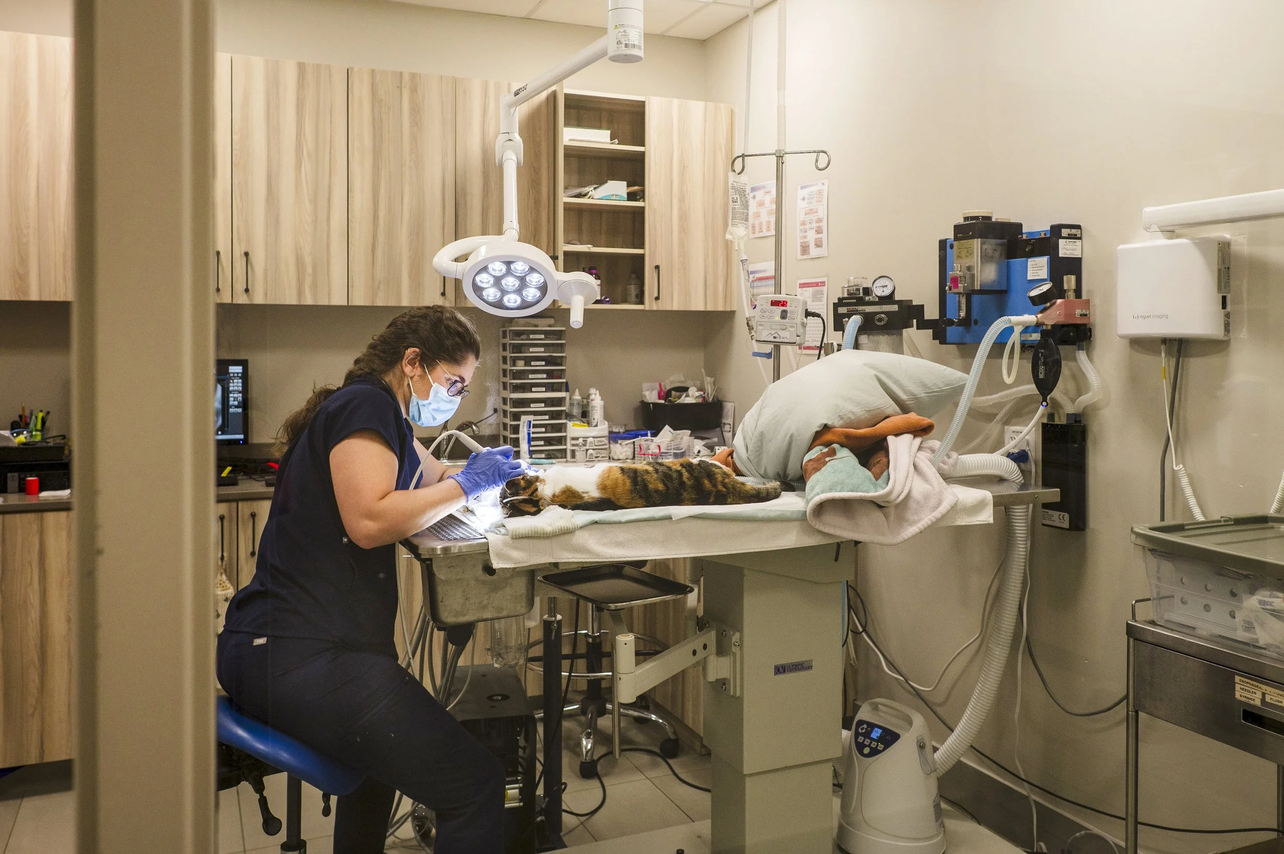 Our dental services include professional dog and cat dental cleanings performed under general anesthesia, the only method that allows for safe, thorough cleaning above and below the gum line. Each cleaning is accompanied by a detailed oral examination and digital dental x-rays, allowing our veterinarians to assess tooth roots and jaw structures not visible to the naked eye. We diagnose and treat a full range of dental conditions including periodontal disease, tooth resorption, fractured teeth, and oral infections. When dental disease or trauma is present, we also perform tooth extractions and minor oral surgery to relieve pain and restore oral health.
